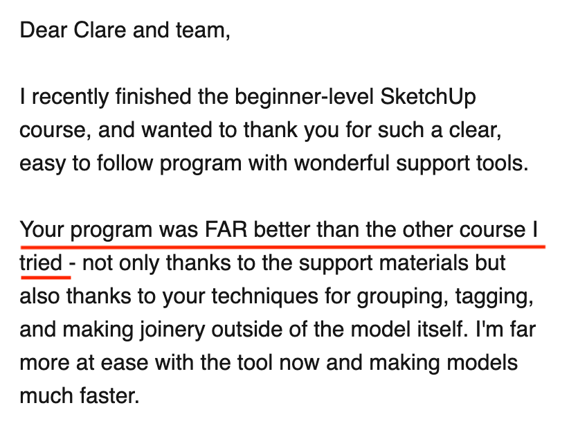 Here’s a very small collection of the nice things people have said along with some of the projects students have completed in my SketchUp courses.